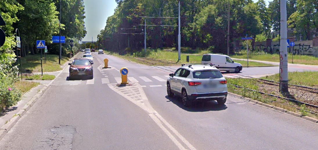 • Obecnie jedynym fizycznym spowalniaczem dla ww. przejścia są zainstalowane wypustki na jezdni (jazda w kierunku północnym), jednak są one zbyt niskie oraz są zainstalowane zbyt daleko od przejścia, aby być skuteczne i wymusić wolniejszą jazdę.